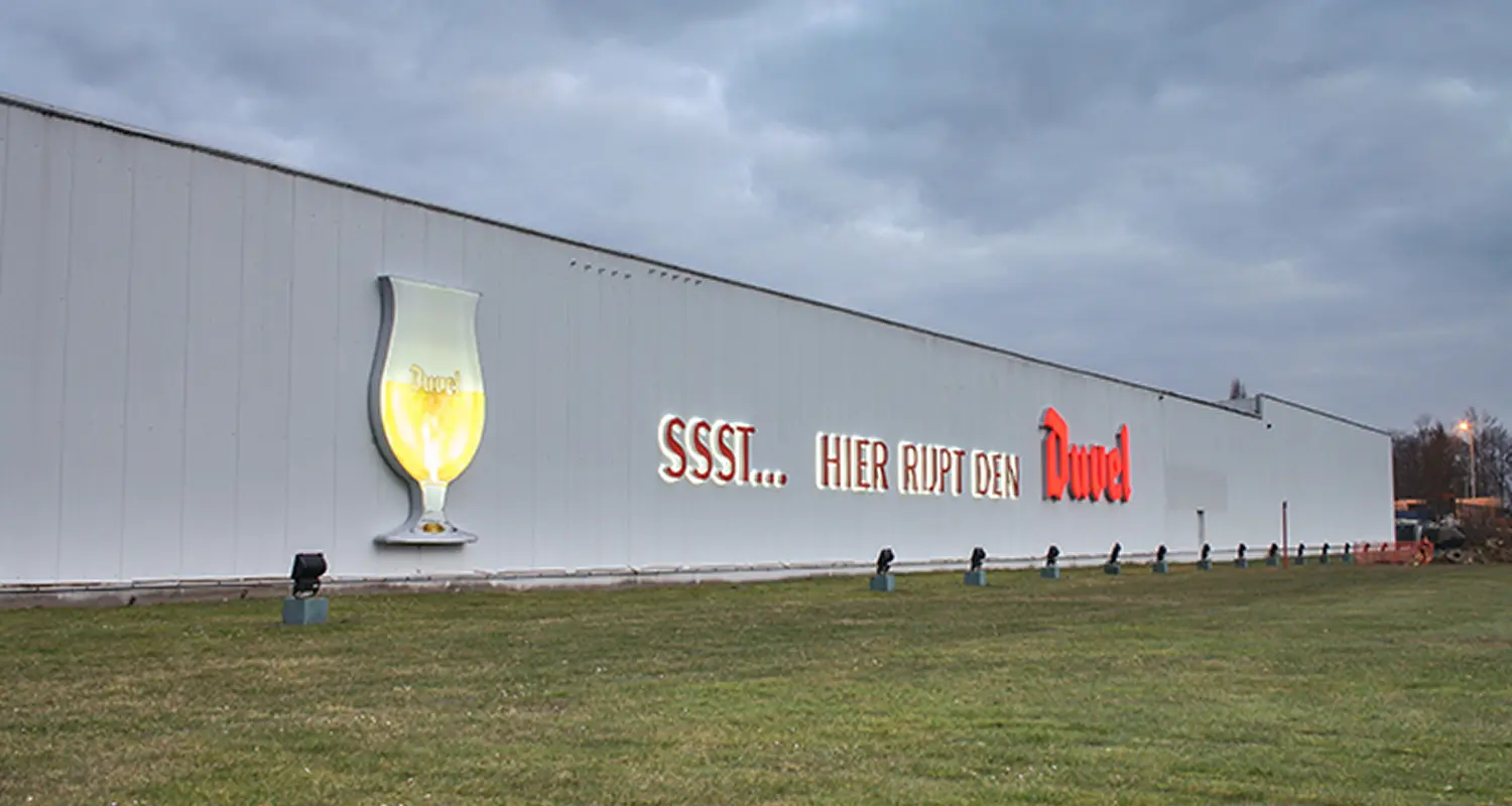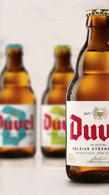 デュベルのロゴの上には、アイコニックなデュベルグラスをデザインした紋章。下部にうっすらと見えるのは、大麦とホップの花で飾られたアントワープ州の紋章だ。